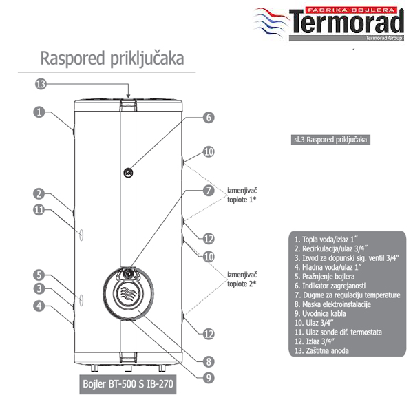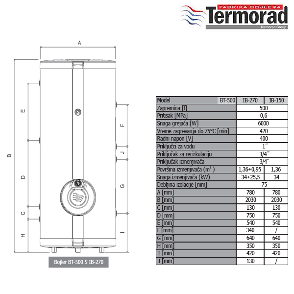 Zapremina 500 L Materijal kazanaprohrom Snaga el.grejača 6000 W Površina izmenjivača 1,92 m2 Radni napon 400 V Radni pritisak 0,6 MPa Zagrevanje 15-75°C 420 minuta Instalacijasamostojeći/desni Garancija na kazan 10 godina Garancija na el. delove 25 meseci