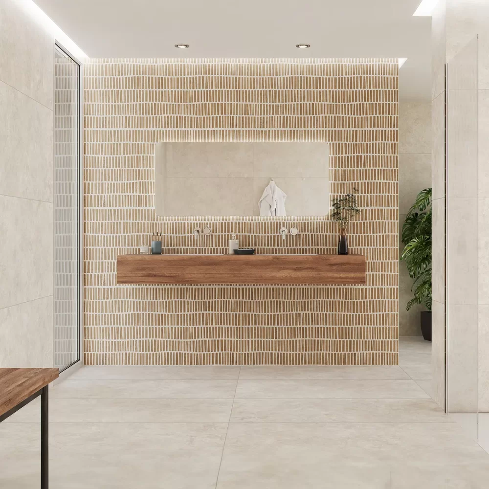 Decor dream natural 59,5×120. Pločice dimenzija 60×120 cm sa mozaik efektom predstavljaju savršen spoj modernog velikog formata i dekorativnog dizajna. Zahvaljujući pažljivo osmišljenom mozaik uzorku, ove pločice stvaraju vizuelno bogatu površinu bez potrebe za postavljanjem sitnih elemenata.
