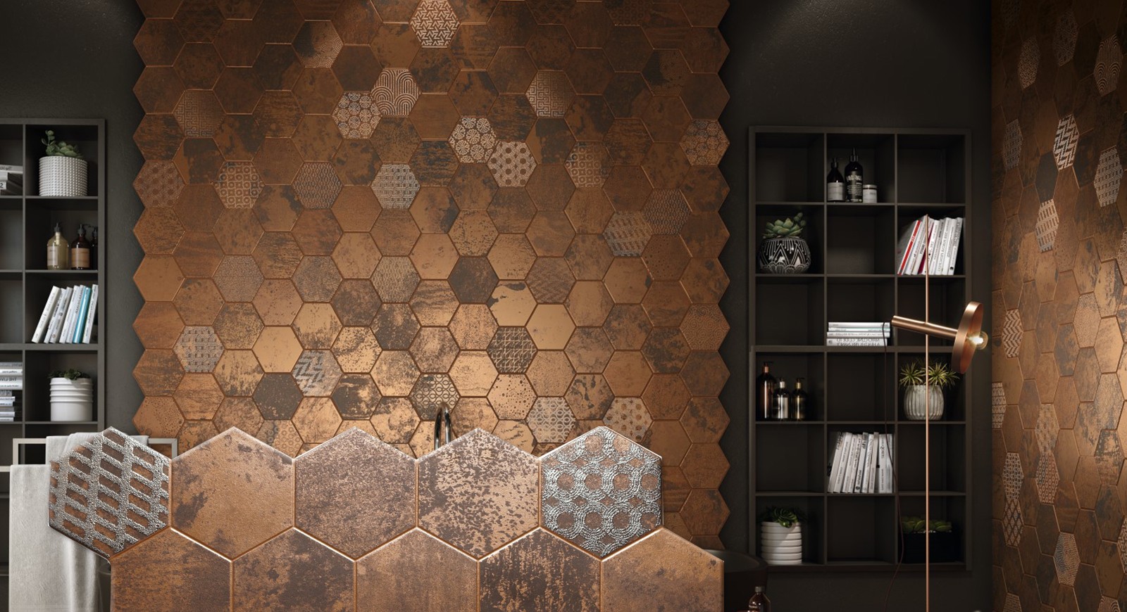 Hive Cobre pločice se savršeno kombinuju sa drvetom, crnim metalom i betonskim površinama, stvarajući snažan i sofisticiran dizajn.