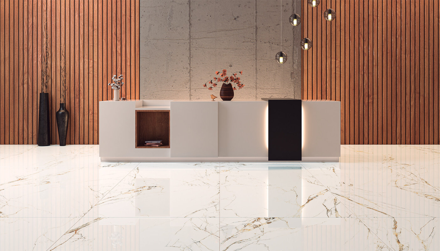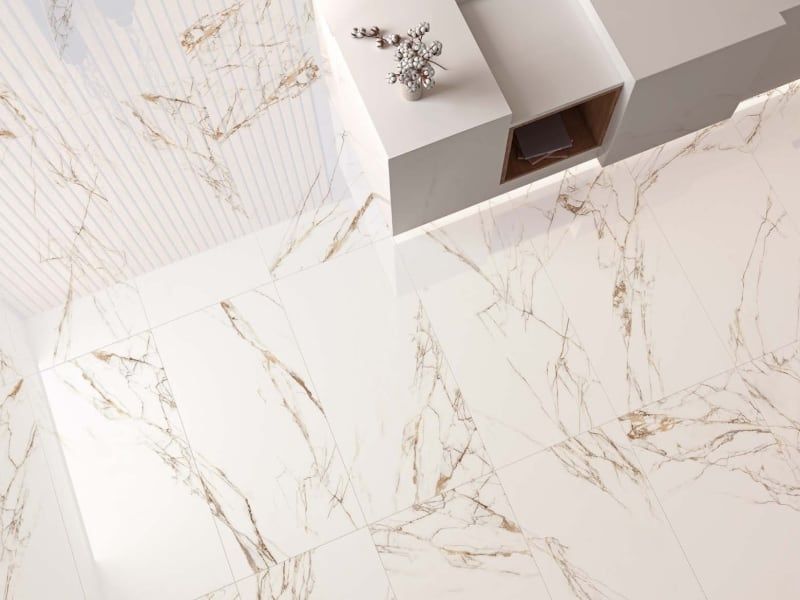 Indah white pulido 59×119. Pločice u luksuznoj Calacatta mermer teksturi sa zlatnim venama predstavljaju vrhunac elegancije i savremenog dizajna. Bela osnova u kombinaciji sa izraženim toplim, zlatno-sivim venama stvara upečatljiv i ekskluzivan vizuelni efekat koji odmah privlači pažnju.