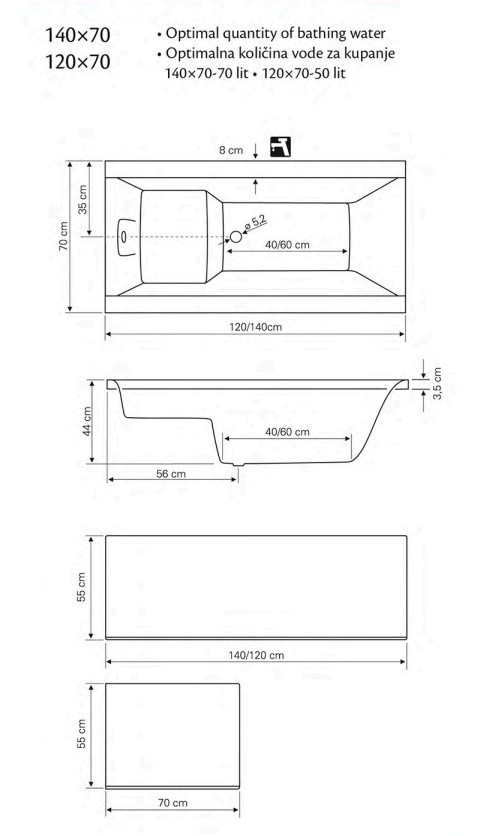 naziv : Kada 120x70 Lilly komplet proizvođač : Roper co. zemlja porekla: Srbija dimenzije : 120x70 materijal : akril boja : bela ojačanje : stakleni mat, poliesterska smola konstrukcija : podkonstrukcija, prednja i bočna obloga način montaže : univerzalan Calypso co. Niš