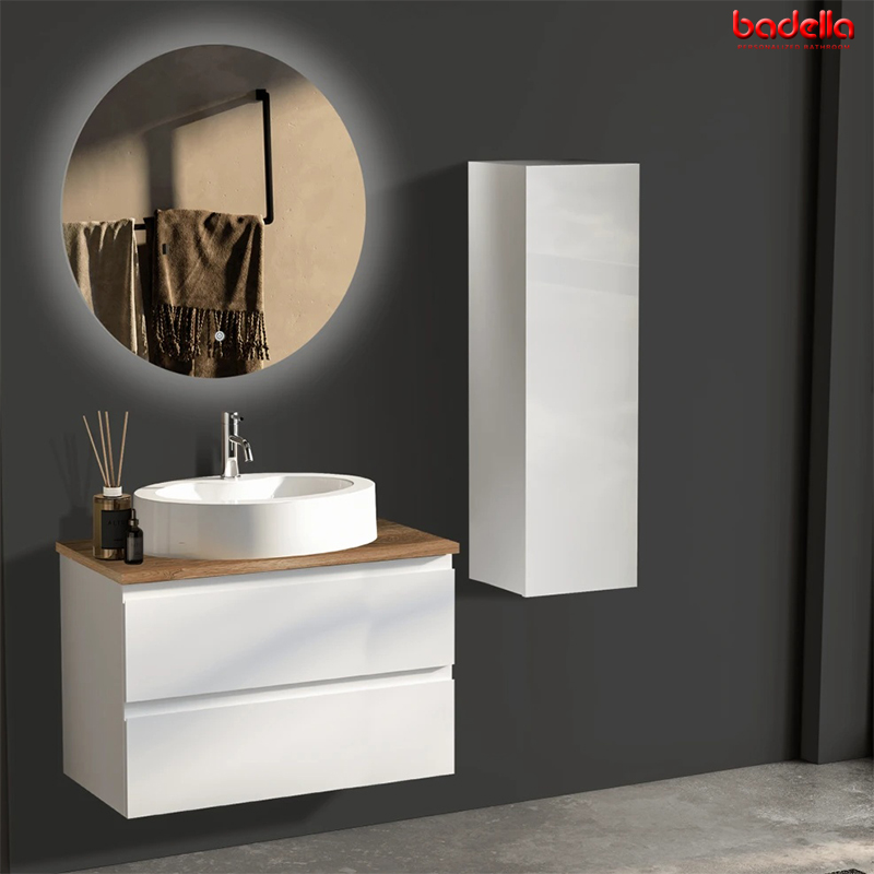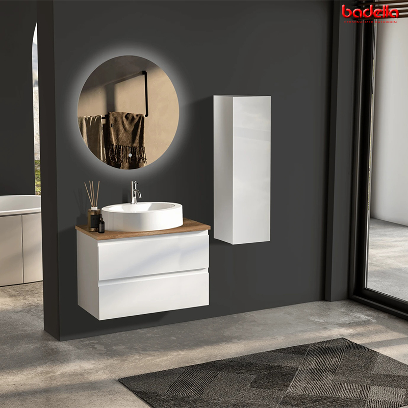 Ormarić sa fiokama za nadgradni umivaonik Materijal: Vrata medijapan, stranice od iverice Soft Close sistem fioke Beli akrilni lak Ploča imitacije drveta