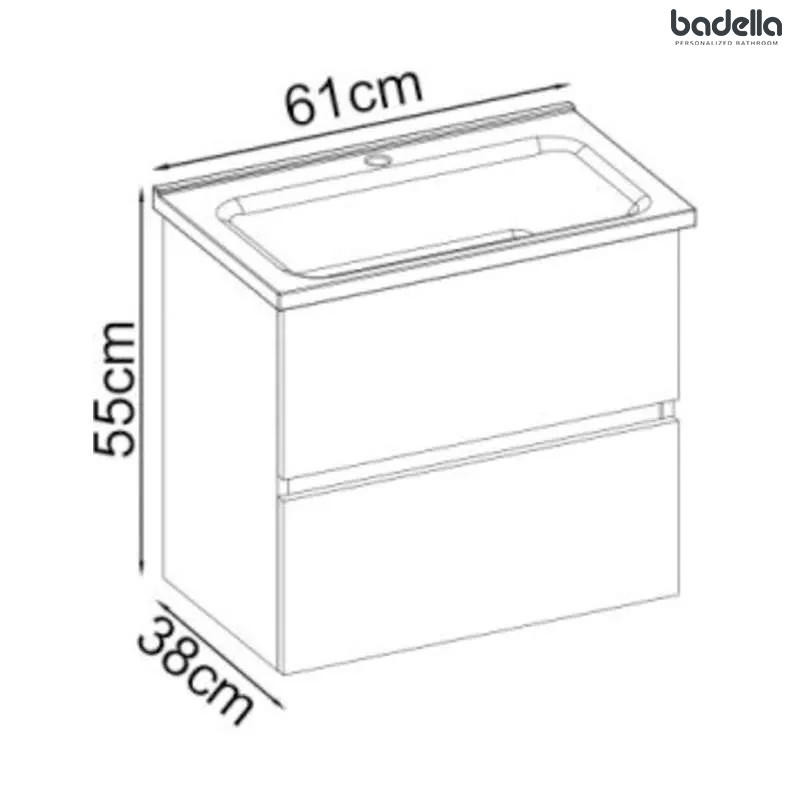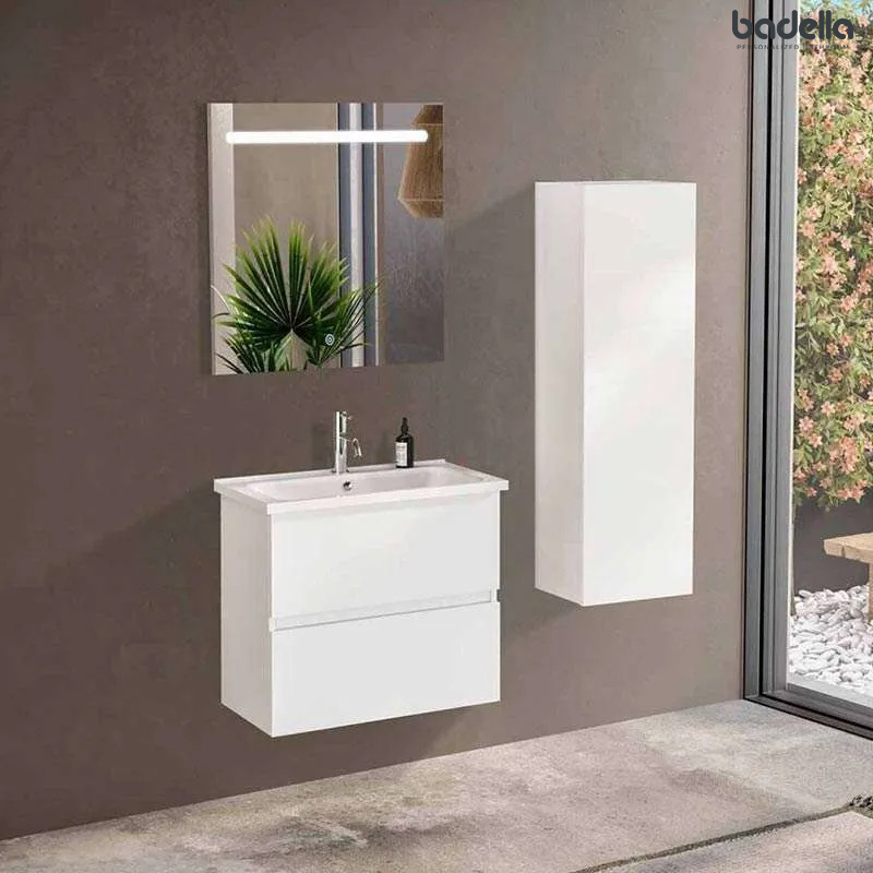 Ormarić za malo kupatilo Zidna montaža Boja: Bela Dve fioke Otvor za bateriju Prelivni sistem Plitki beli ormarić sa lavaboom, idealan za manja kupatila.