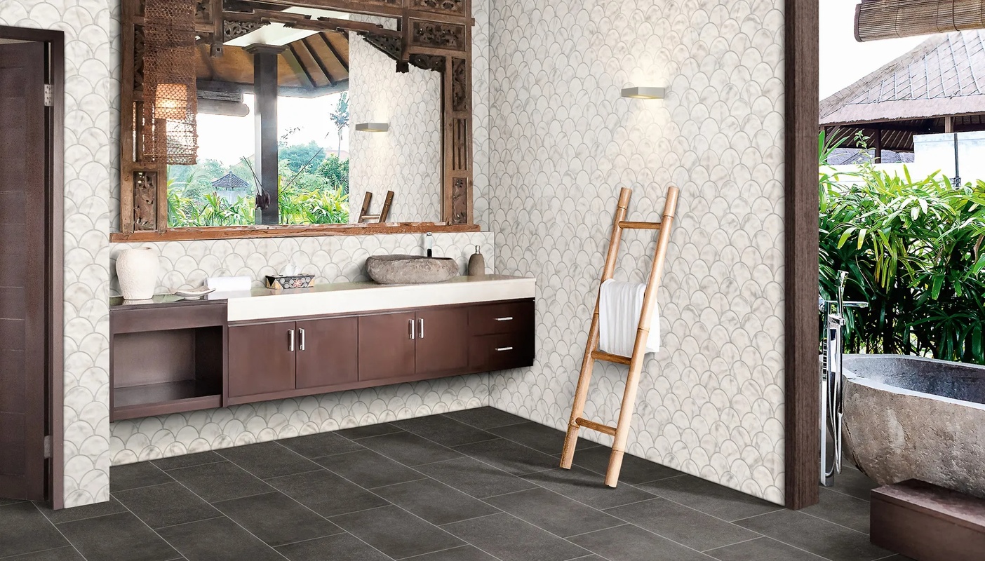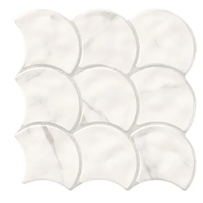 Scale statuario 30,7×30,7. Serija Scale donosi jedinstven i razigran dizajn inspirisan formom riblje krljušti (scallop / fish scale). Ovaj prepoznatljiv oblik unosi mekoću linija i vizuelnu dinamiku u prostor, čineći ga toplijim i dizajnerski zanimljivijim.