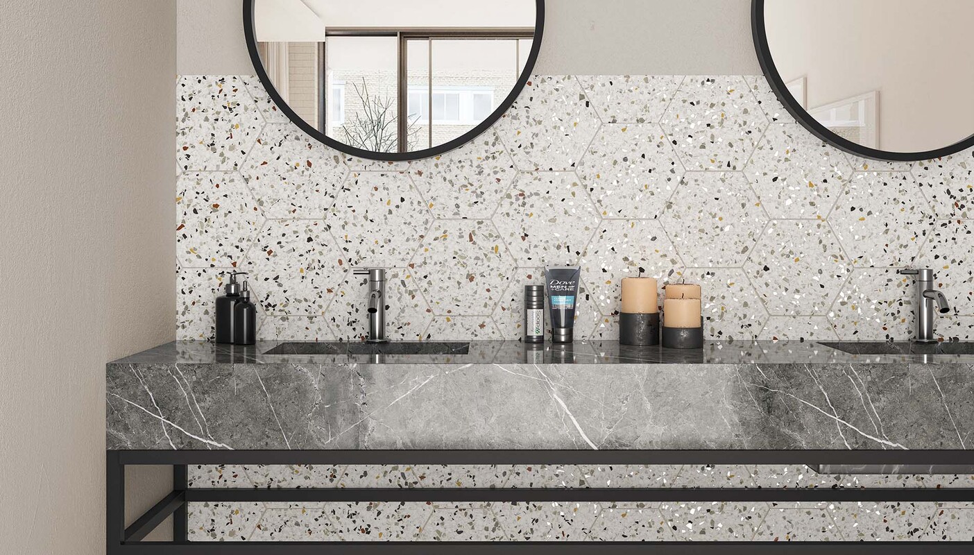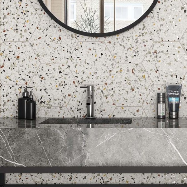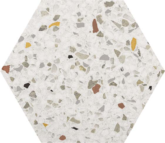 Tempo mix hex 20×24. Serije Inspire i Tempo donose moderan reinterpretirani terrazzo izgled u atraktivnom heksagonalnom formatu. Sa prepoznatljivim “speckled” uzorkom (mešavina sitnih kamenčića u različitim tonovima), ove pločice unose dinamiku i sofisticiranost u svaki prostor.